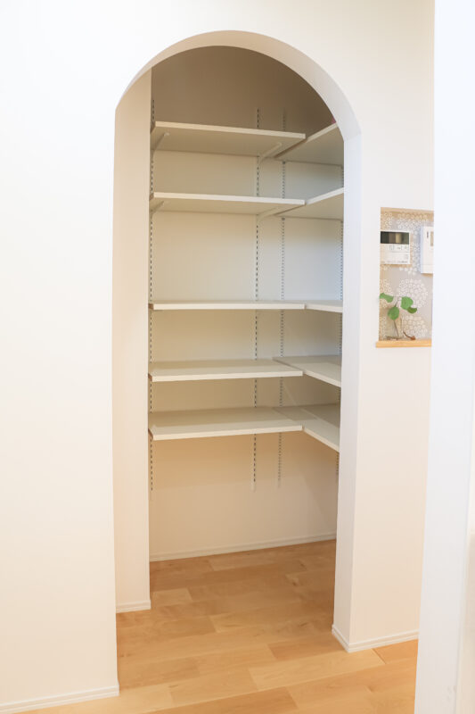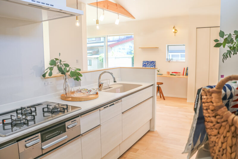 リビングを見渡せるキッチンと、機能性だけでなく可愛さも兼ね備えたパントリーがあるキッチンスペース。
